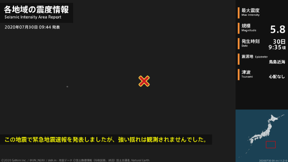 2016/07/30 16:40誤報震源地 東京湾震源深さ 約10km地震の規模 m9.1震度7北海道から四国にかけて全域15秒後にキャンセル報あり。気象庁は落雷が原因ではないかとみて詳しく調べている。<利用ソフトなど>・強震モニタ extension・eqwatch・the last.